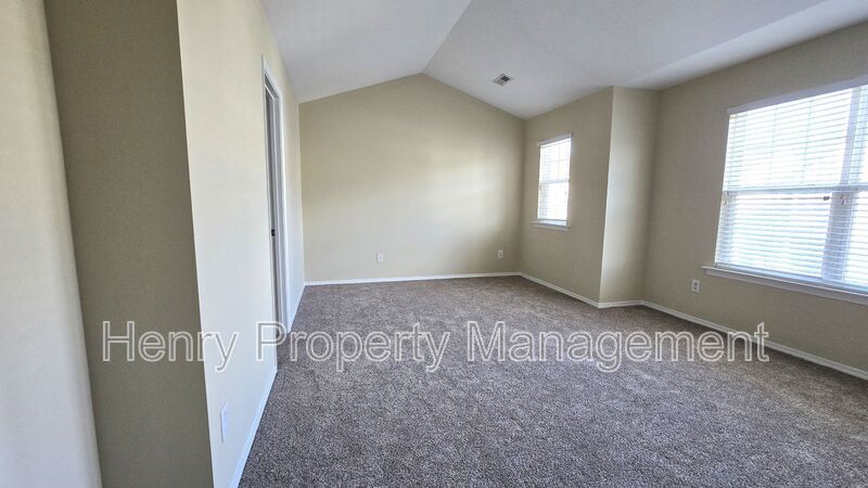 Primary suite boasts vaulted ceilings and large walk-in closet. Attached bathroom includes garden tub/shower and dual vanities.