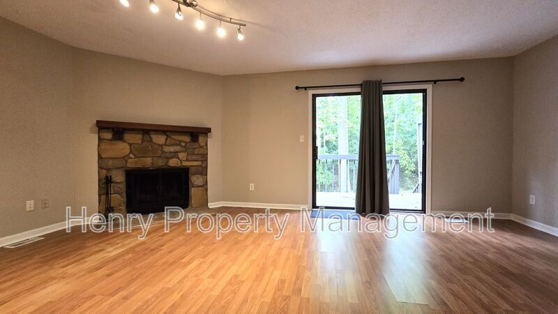 Spacious living room with wood burning fireplace overlooking private deck and wooded backyard.